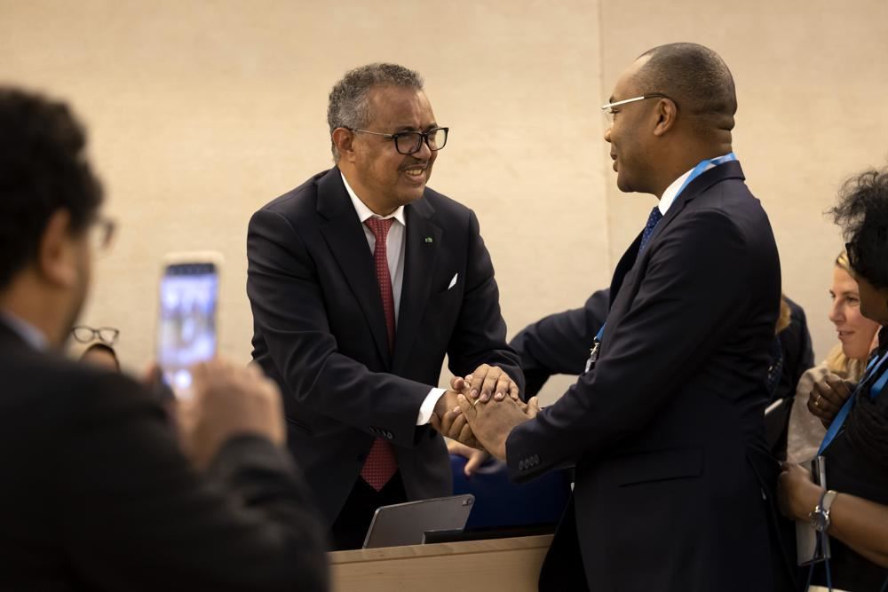 المدير العام لمنظمة الصحة تيدروس أدهانوم غيبريسوس (الى اليسار) يتلقى التهنئة من مندوب بعد إعادة انتخابه، خلال الدورة الـ75 لجمعية الصحة العالمية في جنيف (24 أيار 2022، أ ب).