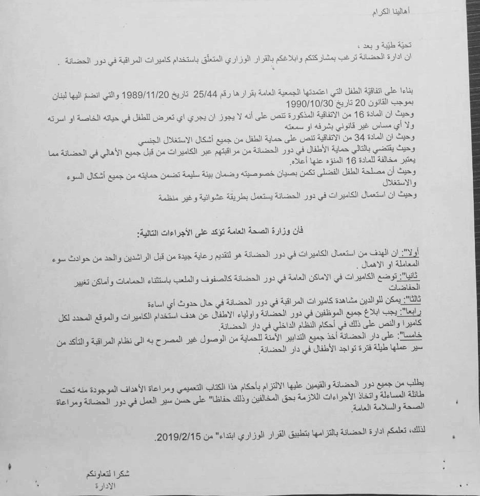 في 22 كانون الثاني 2019، أصدر وزير الصحة السابق غسان حاصباني تعميماً يقضي بإجبار الحضانات على تركيب كاميرات تسجّل ما يحصل في الداخل 24/24، ووصل كاميرات المراقبة بجهاز تلفاز يوضع في مدخل الحضانة حيث يمكن للأهل المراقبة ومعرفة ما يجري في الداخل.