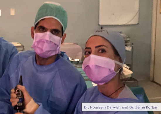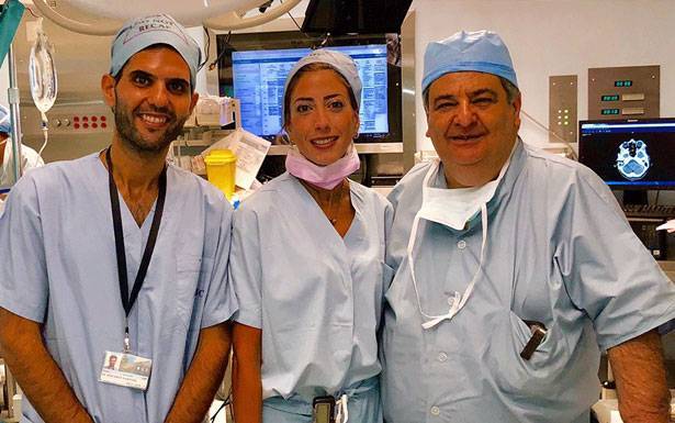 من اليسار إلى اليمين: جرّاح الدماغ والعمود الفقري الدكتور حسين درويش من دائرة الجراحة، في قسم جراحة الأعصاب والدماغ والعمود الفقري في المركز الطبي في الجامعة الأميركية في بيروت، الدكتورة زينة قربان، والدكتور أسامة هادي من دائرة الأذن والأنف والحنجرة.