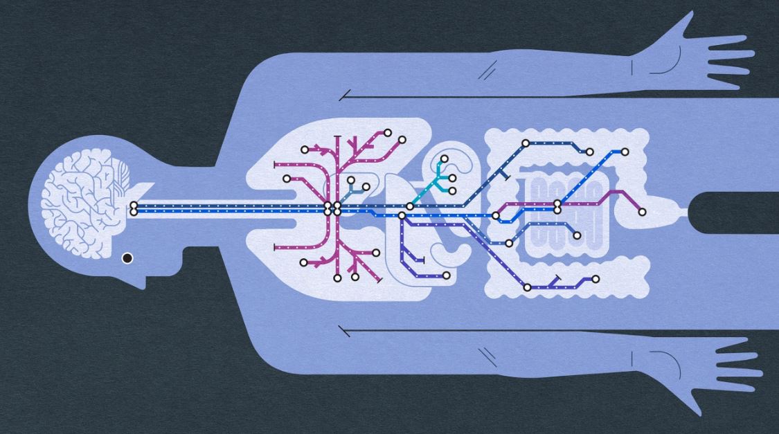 على غرار نظام الطرق السريعة، يتفرع العصب الحائر من الدماغ ليصل إلى أعضاء الجسم المختلفة ويسهم في تنظيم وظائفها، بما في ذلك بعض جوانب العقل مثل المزاج، المتعة والخوف.