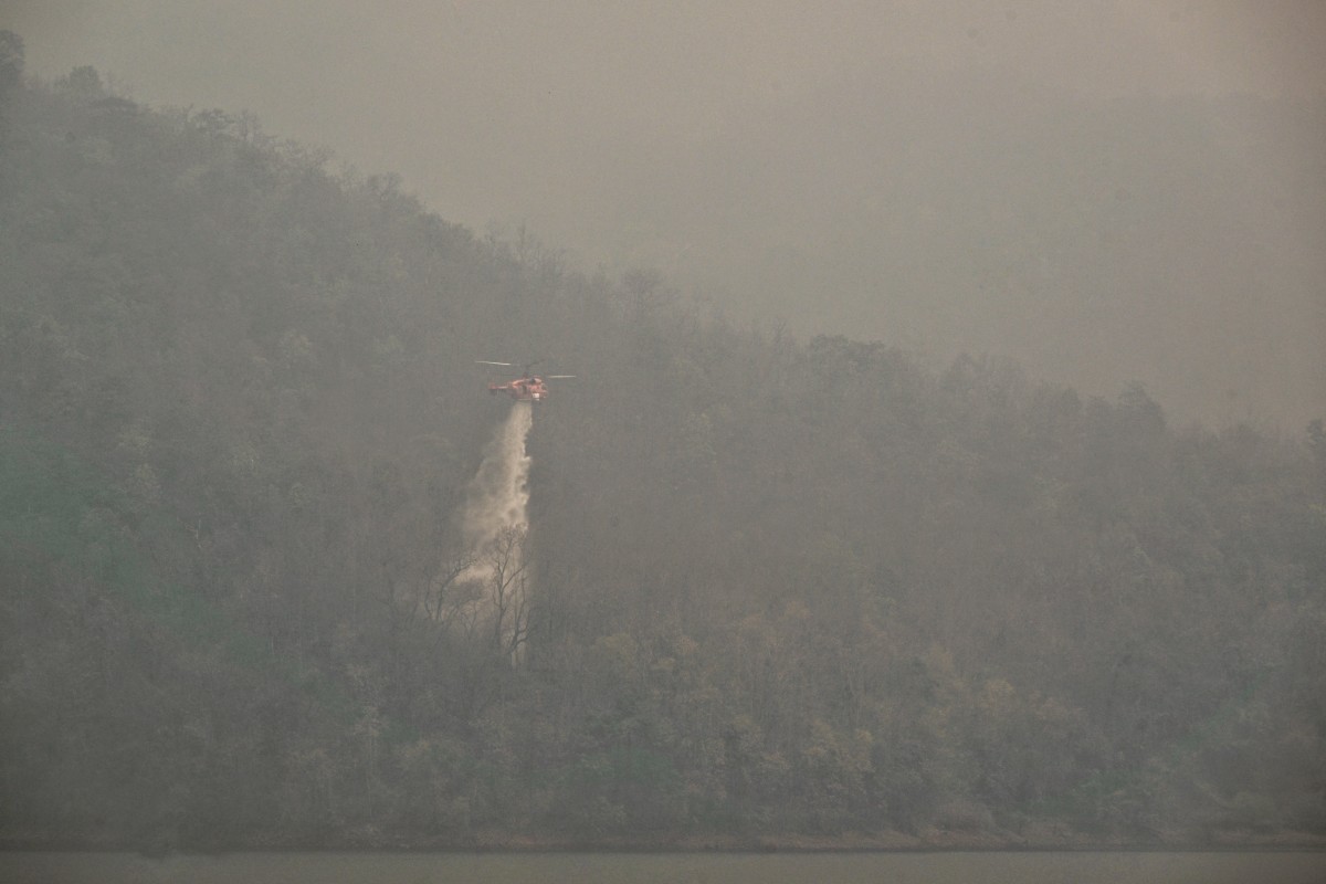 مروحية إطفاء تنقل المياه لمكافحة حرائق الغابات وسط تلوث الهواء الشديد في سد ماي نغات سومبون تشون في مقاطعة شيانغ ماي شمال تايلاند (16 آذار 2024 - أ ف ب)