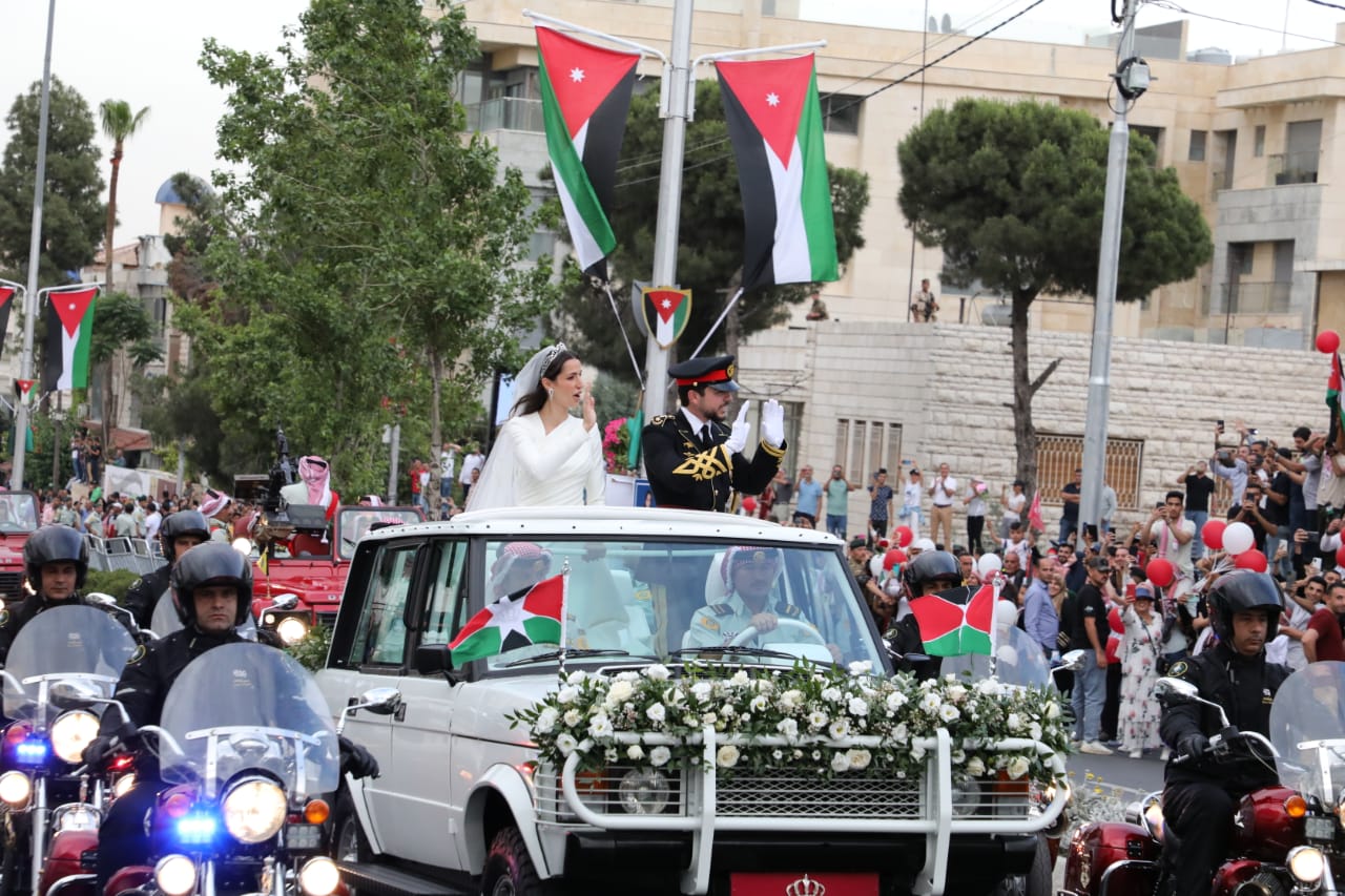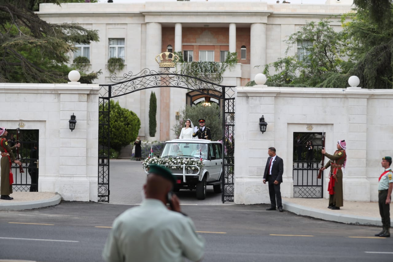 وبعد إتمام عقد القران، استقبل العروسان الضيوف ثمّ غادرا بالموكب الأحمر إلى قصر الحسينية على متن سيارة كلاسيكية من نوع "رينج روفر"، تعود لجد الأمير الحسين الملك الحسين، حيث كانت السيارة ذات اللون الأبيض مزينة بالعلم الخاص بولي العهد.