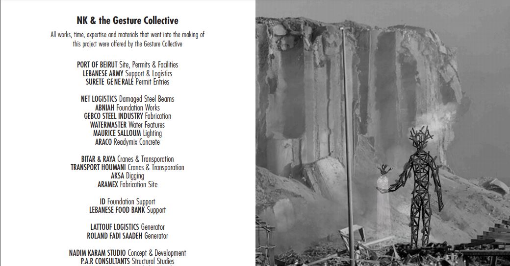 ويضيف: "بعد دخول الشركات في شكل عفوي، أعطى الجميع من وقته ومعدّاته وتفكيره رغبة منهم في إنجاز هذا المجسّم، نظراً إلى الرمزية التي يحملها. فضخامة المجسّم هي في الطريقة التي نُفّذ فيها لا بحجمه، لأنّ حجمه يبقى صغيراً جداً أمام حجم الجريمة التي ارتُكبت في حقّنا. وتكمن أهميته بوجوده في بيروت حتى تذكّرنا دائماً جروحاته بانفجار الرابع من آب، وليكون وقوفه مُخرِجاً من يده الماء إظهاراً لإرادة الشعب اللبناني بالحياة والوجود، ومطالباته بأن يكمل الطريق حتى نصل إلى الحقيقة والعدالة وراحة النفس".