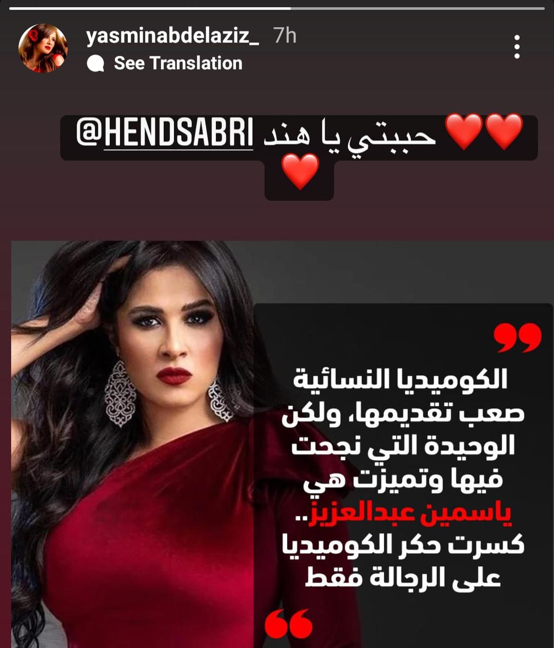 أشادت الفنانة هند صبري ببراعة ياسمين عبدالعزيز وموهبتها في تقديم كوميديا نسائية ناجحة، ووجهت الأخيرة رسالة لها عبر خاصية "ستوري" في حسابها عبر "إنستغرام"، معلقة: "حبيبتي يا هند".