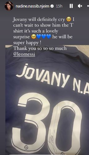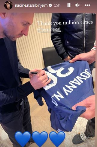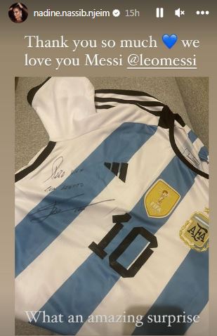 كما أحبّت نجيم أن تشارك جمهورها بهدية "مميّزة" حصلت عليها وابنها جيوفاني من لاعب كرة القدم العالمي ليونيل ميسي، وهي عبارة عن قميصَين للمنتخب الأرجنتيني موقّعَين من ميسي، موثّقة هذه اللحظة بصور ومقطع فيديو نشرتها عبر خاصية "ستوري" في حسابها عبر "إنستغرام".