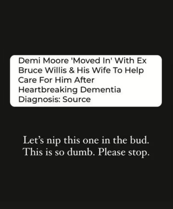 ونشرت إيما عبر تطبيق "إنستغرام" الخبر المعنون: "ديمي مور تنتقل للعيش مع بروس ويليس وزوجته للمساعدة في رعايته"، وعلّقت قائلةً: "دعونا نقلع المشكلة من جُذورها. هذا الأمر غبيّ للغاية. أرجوكم توقفوا".