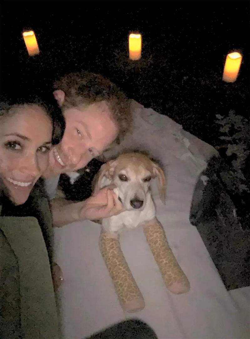 وشارك الزوجان عدداً من الصور منذ اليوم الذي طلب فيه الأمير هاري الزواج بميغان، حيث ظهر الأمير في إحدى اللقطات على ركبة واحدة ممسكاً بعلبة الخاتم بيده، بينما كان كلب ميغان جالساً إلى جانبه والشموع تحيط بالمكان.