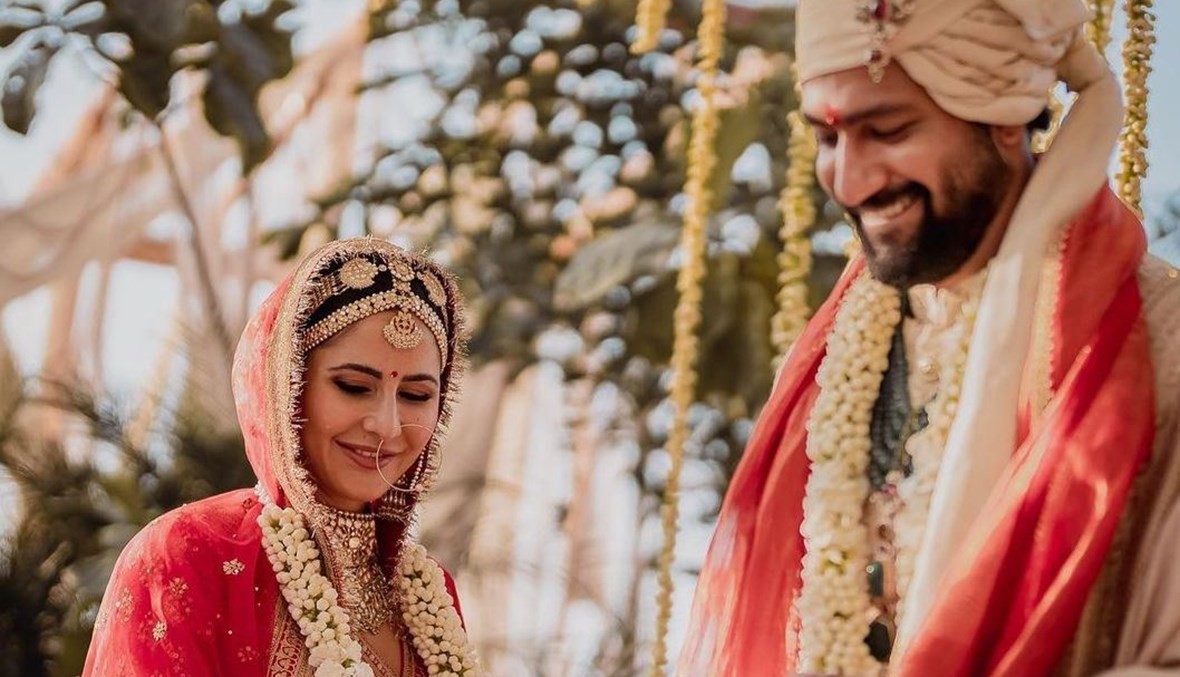 وتألق العروسان بإطلالة من تصميم سابياساتشي Sabyasachi، الذي شارك تفاصيل الإطلالة في حسابه الخاص عبر "إنستغرام". وأطلّت كاترينا بالساري الهندي الأحمر والمنسوج يدوياً من حرير ماتكا وتم تزيين حجابها بالكيران المصنوع يدوياً والمطلي بالذهب.  أما العريس، فأطل بِزيّ الزفاف التقليدي والمصمم من الحرير العاجي.