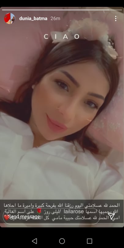 بدورها، نشرت بطمة مقطع فيديو لها عبر خاصية "الستوري"، وكتبت: "الحمدالله على سلامتي. اليوم رزقنا الله بفرحة كبيرة وأميرة، ما أحلاها، الله يحميها، واسمها ليلي روز، على اسم أمي الغالية".