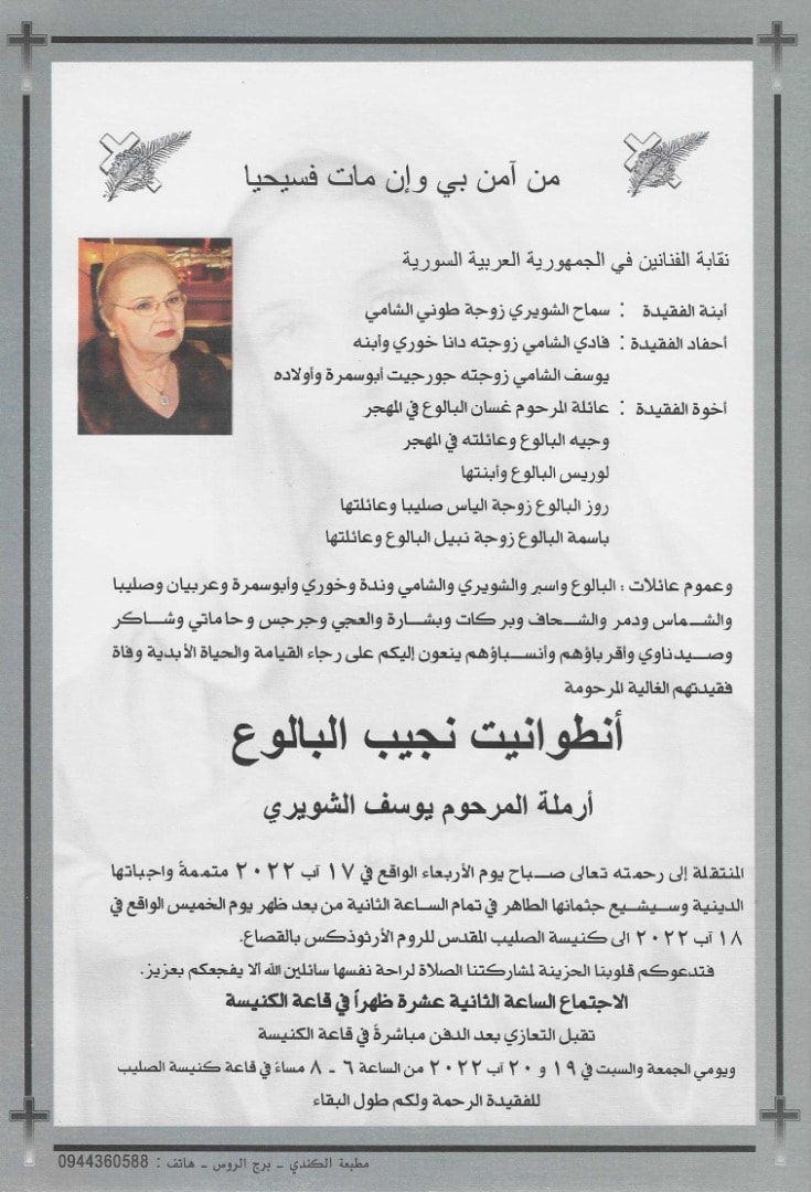 وستقبل التعازي يومي الجمعة والسبت من الساعة السادسة إلى الثامنة مساء في قاعة كنيسة الصليب بالقصّاع.