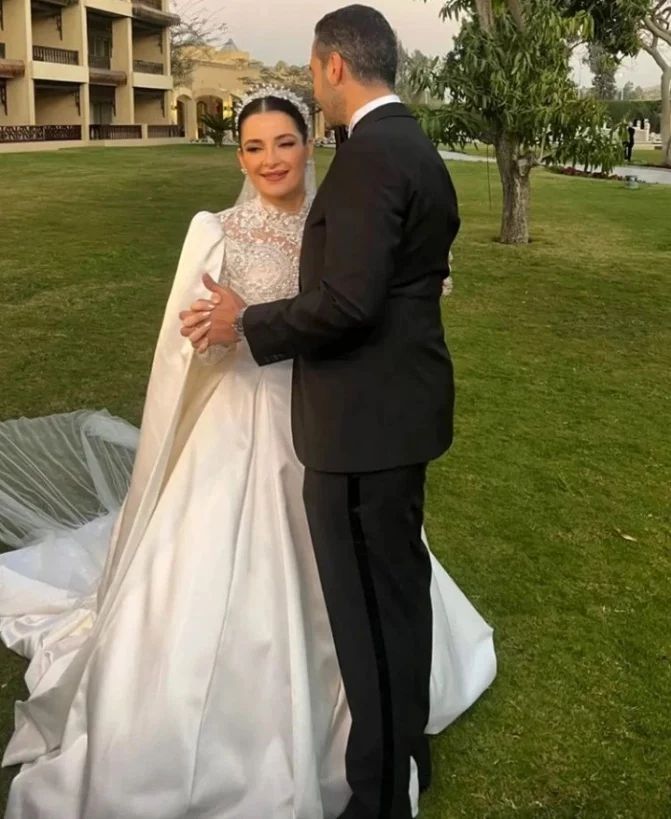 شام اختارت ثوب زفافها بسيطاً وناعماً بتطريز خفيف في الجزء العلوي من الفستان، واهتمّ بإطلالتها خبير التجميل بسّام فتوح.