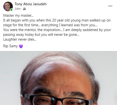 وتابع: "تلميذ إيفيت سرسق، دخل قلوب الناس من خلال قناة 9 الفرنكوفونية وبرنامج "Yvette reçoit". شكّل مع زوجته نائلة ثنائياً في الحياة وعلى المسرح، هي مع غيتارها وصوتها الجميل وهو من خلال غزارة التأليف فوقّع 55 عملاً مسرحياً. توقّف قلب سامي بعدما كان يعيش في سنواته الأخيرة مرارة الأسى على عالمٍ أعطاه حياته، لكنّه بادله الجحود وقلّة الوفاء. الحيوانات الاليفة التي أحبّها وأطعمها واحتضنها أضحت يتيمة. سنشتاق لك سامي. وداعاً".