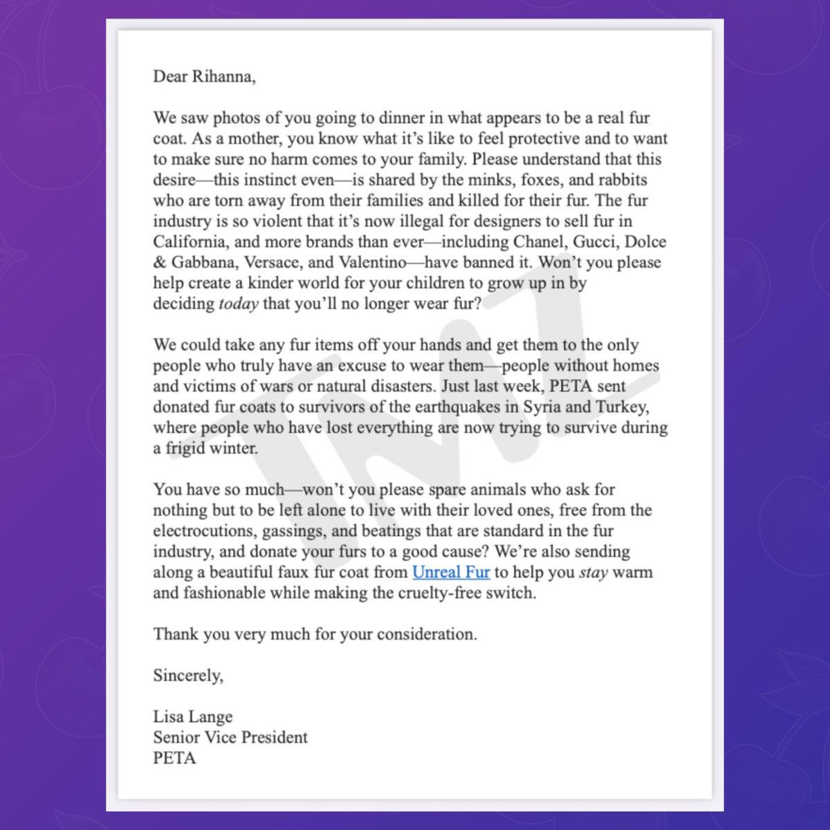 وطالبت الجمعية ريهانا بأن تساعد في خلق عالم أكثر لطفاً لطفليها كي يكبرا مع قناعة بعدم ارتداء الفراء.