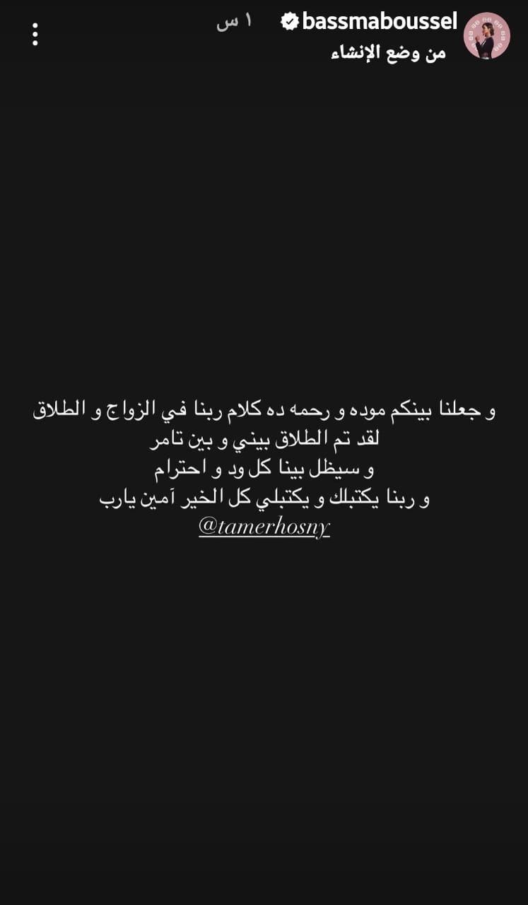 وكتبت بوسيل، عبر خاصية "ستوري" في حسابها عبر "إنستغرام": "وجعلنا بينكم مودة ورحمة، دا كلام ربنا في الزواج والطلاق لقد تم الطلاق بيني وبين تامر حسني".