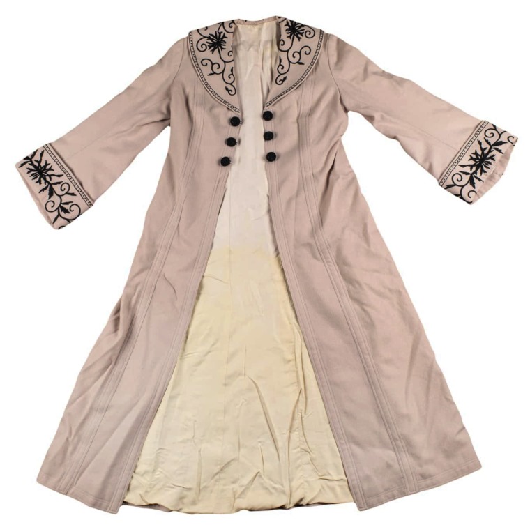 وكانت مصمّمة المعطف ديبورا لين سكوت قد حازت بفضله على جائزة الأوسكار لأفضل تصميم أزياء عن عملها في فيلم "تيتانيك"، وهو من الصوف الورديّ مع تطريز أسود بنقوش الأزهار.