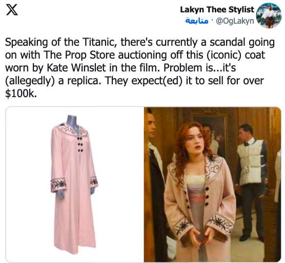 كشفت صحيفة "نيويورك بوست" عن عرض معطف كيت وينسلت الشهير، الذي يعتبر من أحدث مقتنيات فيلم "تيتانيك"، في مزادٍ علنيّ، بعد مرور أكثر من ربع قرن على طرح الفيلم.