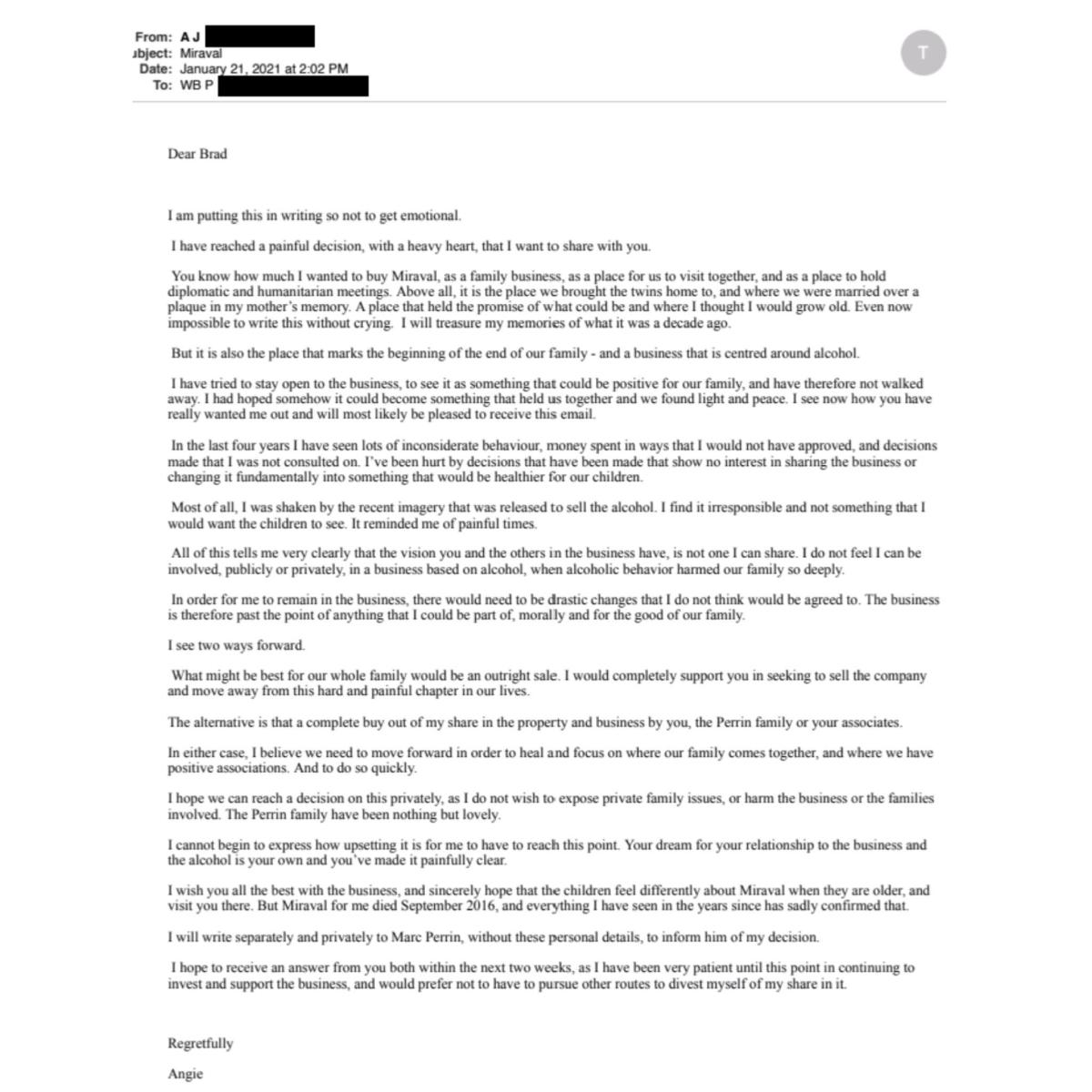 تابعت أنجلينا: "يمثل هذا المكان بداية عائلتنا ونهايتها"، مشيرة إلى أنها كانت تأمل أن يجمعهما "بطريقة ما، لكنها شعرت بأن بيت أراد "خروجها وسيسعد على الأرجح عند تلقي هذا البريد الإلكتروني".