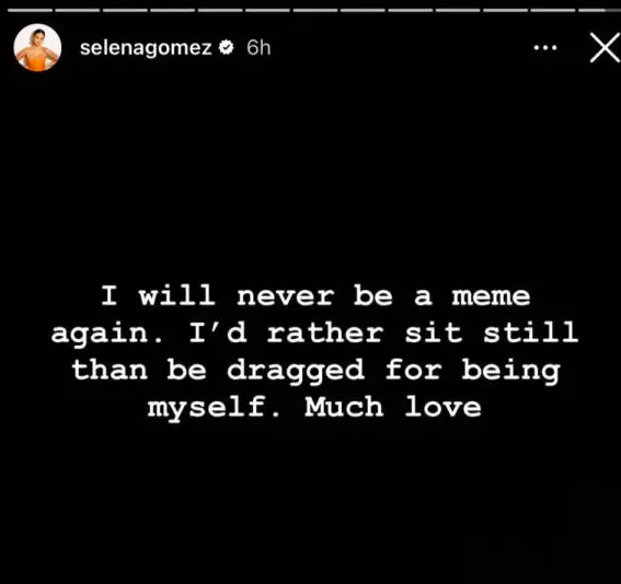 وبعد شعورها بأنّها ستتحوّل لمثار سخرية واستهزاء، نشرت سيلينا ستوري عبر حسابها في "إنستغرام" قائلةً: "لن أكون ميم مرّة أخرى. أفضّل الابتعاد بدلًا من أن يتمّ استدراجي لمجرّد أنّي تصرّفت على طبيعتي. لكم منّي الكثير من الحبّ".