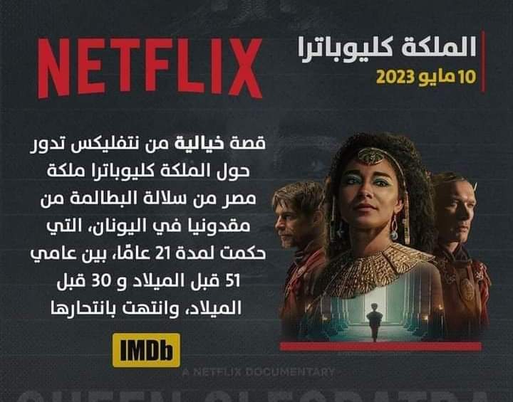 يبدو أن الفيلم الوثائقي الذي أنتجته منصة "نتفليكس" عن الملكة كليوباترا، سيستمر في إثارة الجدل عقب الإعلان عنه، بعدما تناقل كثير من ناشطي مواقع التواصل الاجتماعي أنباء عن أن المنصة عدلت الفيلم ووضعته تحت تصنيف فئة الخيال، بعد اعتراض عدد كبير من روّاد التواصل الاجتماعي ومتخصصون في علم الآثار المصريين ومطالبتهم بوقف عرض الفيلم ومقاطعته لأنه يُعد حملة لتشويه الحضارة المصرية.