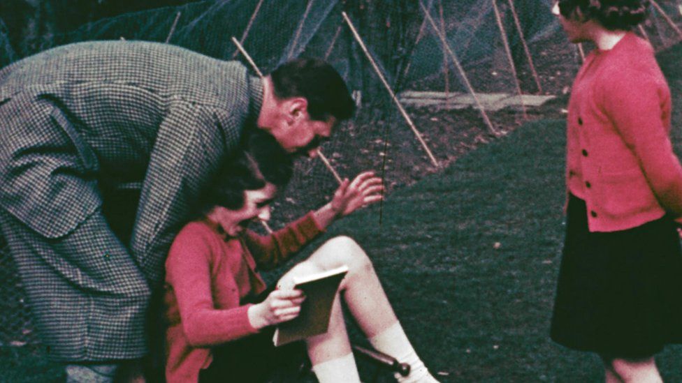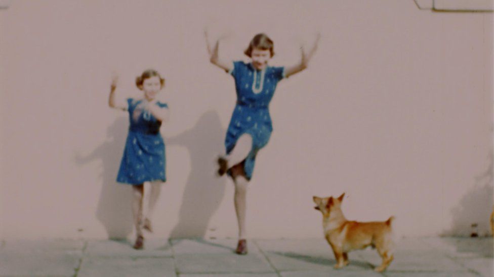 ومن بين اللقطات مشهد التقط في العام 1940، وفيه تظهر الأميرة الشابة إليزابيث وشقيقتها الأميرة مارغريت ترقصان بفساتين منقّطة باللونين الأزرق والأبيض.