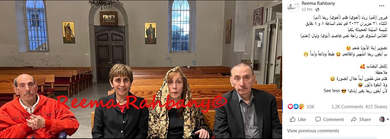 ريما، وكما جرت العادة، ترفق كلّ صورة أو مقطع فيديو تنشره على صفحتها عبر "فايسبوك" بتعليق تعريفيّ عن تفاصيل ما يراه الجمهور، فكتبت: "فيروز (إمّي) زياد (أخوي) هلي (أخوي) ريما (آني)، الثلثاء 21 حزيران 2022 في تمام الساعة 8 و 8 دقائق في كنيسة السيّدة المحيدثة بكفيا، القدّاس السَنوي عن راحة نفس عاصي (أبوي) وليال (إختي)".
