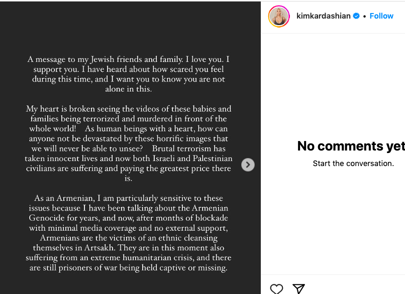 نشرت نجمة تلفزيون الواقع كيم كارداشيان بياناً مطولاً حول الصراع في إسرائيل وفلسطين وحتى أرمينيا.