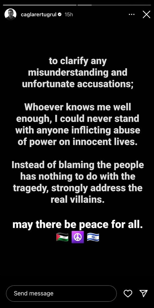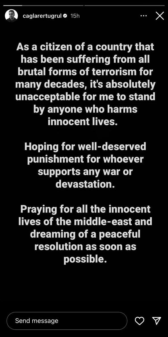 وكتب أرطغرل عبر خاصيّة "ستوري" في "إنستغرام": "كمواطن في بلد يعاني من جميع أشكال الإرهاب الوحشية منذ عقود عديدة، أنا لا أقبل على الإطلاق التضامن مع أيّ شخص يؤذي حياة الأبرياء، وآمل العقاب المستحق لكلّ من يدعم أيّ حرب أو دمار. نصلّي من أجل جميع الأرواح البريئة في الشرق الأوسط ونحلم بحلّ سلميّ في أقرب وقت ممكن".