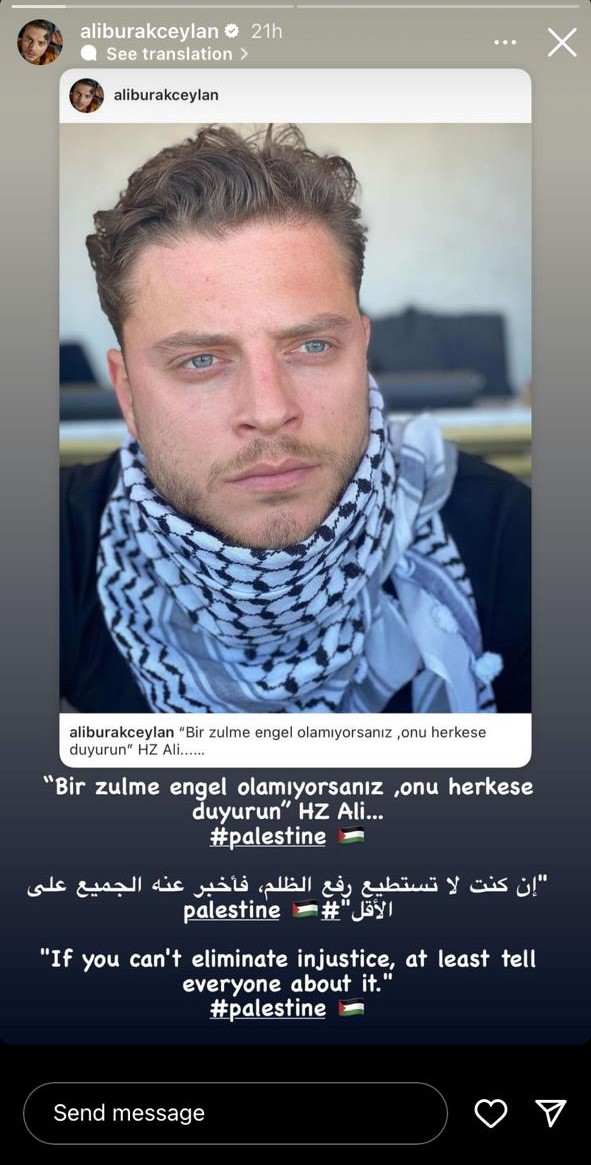 وتضامناً مع الشعب الفلسطيني إزاء الجرائم التي ترتكب بحقّه من قبل قوّات الاحتلال الإسرائيلي، أعلن الممثّل علي بوراك جيلان عبر حسابه الرسمي في "إنستغرام" دعمه وتضامنه مع فلسطين المحتلة، وشارك، عبر "ستوري"، منشوراً سابقاً له، كتبه عام 2021، يتضمّن صورة له بـ"الكوفية" الفلسطينيّة، وعلّق عليه قائلاً: "إن كنت لا تستطيع رفع الظلم، فأخبر عنه الجميع على الأقل، فلسطين".