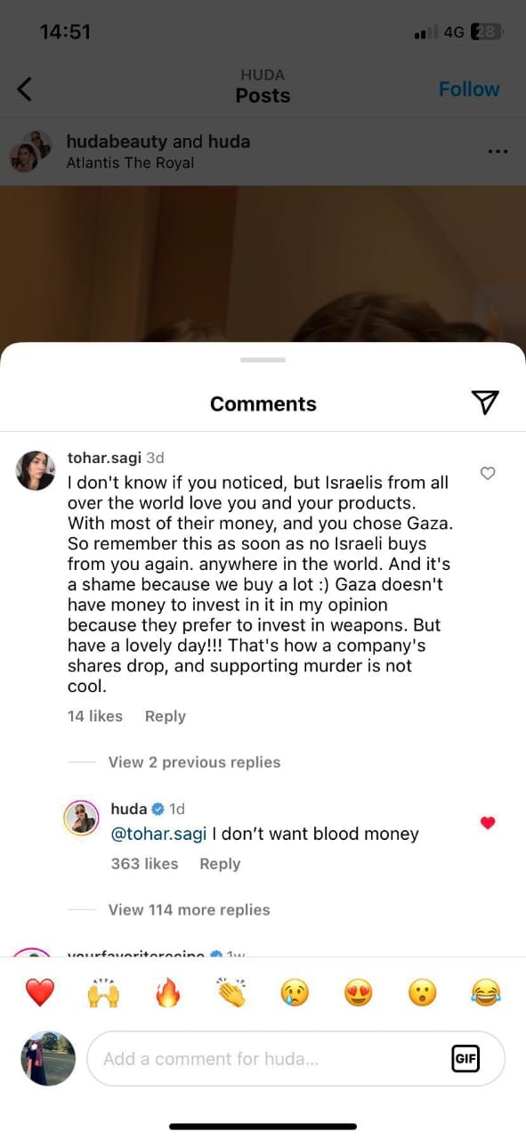 فقد علّقت متابعة إسرائيلية على أحد المنشورات: "لا أعرف إذا كنتِ على علم بأنّ الإسرائيليين حول العالم يحبونك ويحبّون منتجاتكِ. ورغم ذلك، اخترت غزّة. لذا تذكّري ذلك حين عدم شراء أيّ إسرائيلي من منتجاتك مرّة أخرى".