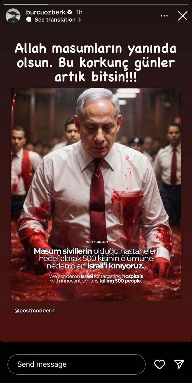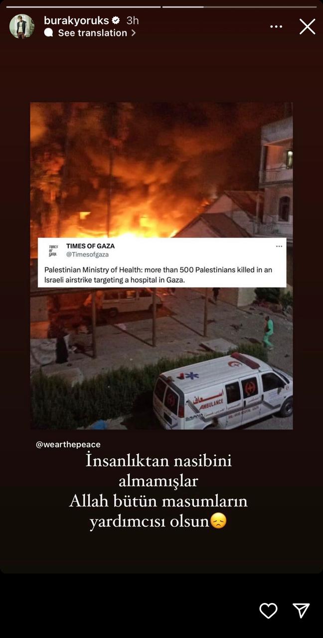 وكتب الممثّل بيرك أتان عبر حسابه في "إنستغرام": ماذا يعني تفجير المستشفى في غزّة يا إسرائيل القاتلة الوضيعة الخسيسة؟ هؤلاء مخلوقات من دون دم، لا يرون أمامهم".