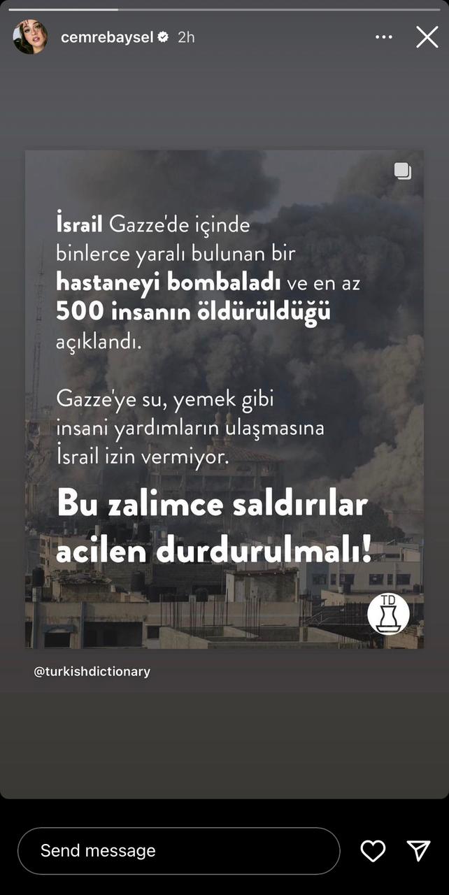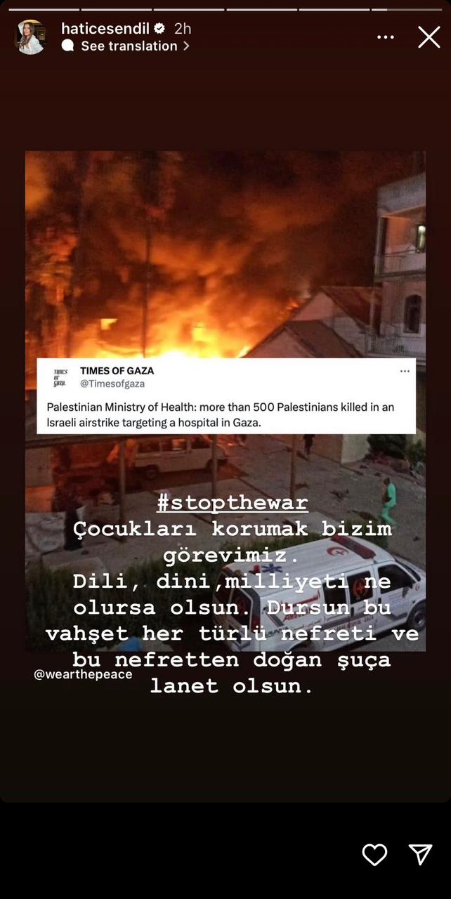 وبعد أن كانت تطالب بالسلام بين الدولتين، نشرت الممثّلة بينار دينيز عبر حسابها في "إنستغرام" صورة لمجزرة المستشفى، وعلّقت قائلة: "لا أستطيع أن أنظر، قلبي يؤلمني... عدم القدرة على فعل أيّ شيء هو شعور مخيف، لماذا يصمت العالم عن هذا الظلم؟ فلسطين حرة".
