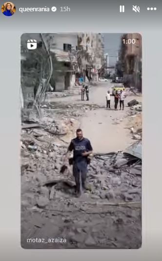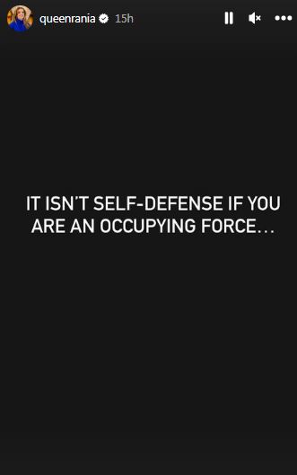 واعتبرت الملكة رانيا العبدالله أنّه "ليس دفاعاً عن النفس إن كنت قوة احتلال"، تزامناً مع الحصار الذي تشهده غزّة وما يتعرّض له الشعب الفلسطيني من بطش قوات الاحتلال الإسرائيلي.