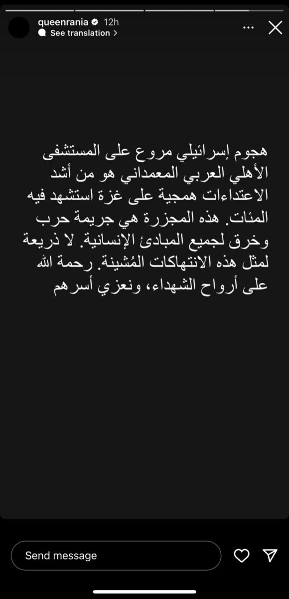 جددت الملكة رانيا العبدالله تضامنها المطلق مع الشعب الفلسطيني في الألم الكبير الذي يعتريه على الحصار والقصف الإسرائيلي المتواصل على قطاع غزة. واستبدلت ملكة الأردن صورة صفحاتها على مواقع التواصل الاجتماعي بأخرى سوداية، حداداً على الشهداء الفلسطينيين الذين سقطوا تزامناً مع مجزرة المستشفى الأهلي المعمداني.