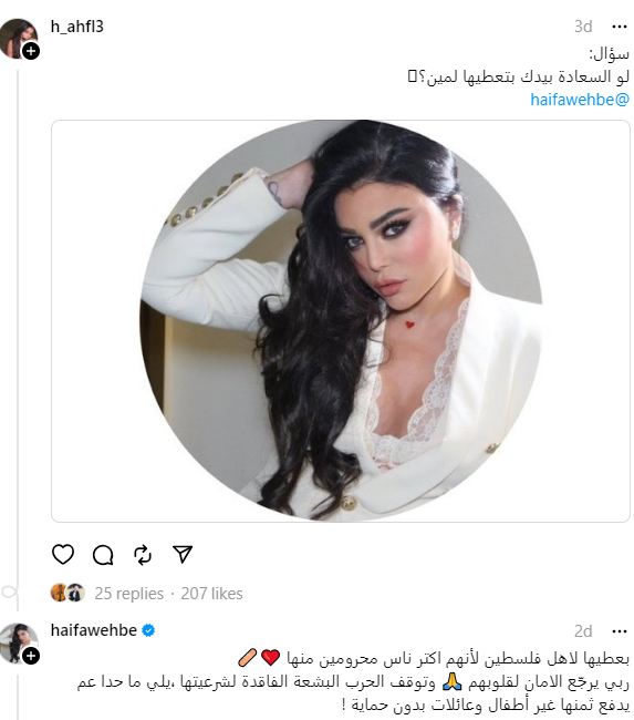 وأجابت وهبي على سؤال أحد المتابعين، وجاء فيه: "لو السعادة بيدك بتعطيها لمين؟"، فأجابت: "أعطيها لأهل فلسطين لأنهم أكثر ناس محرومين منها".