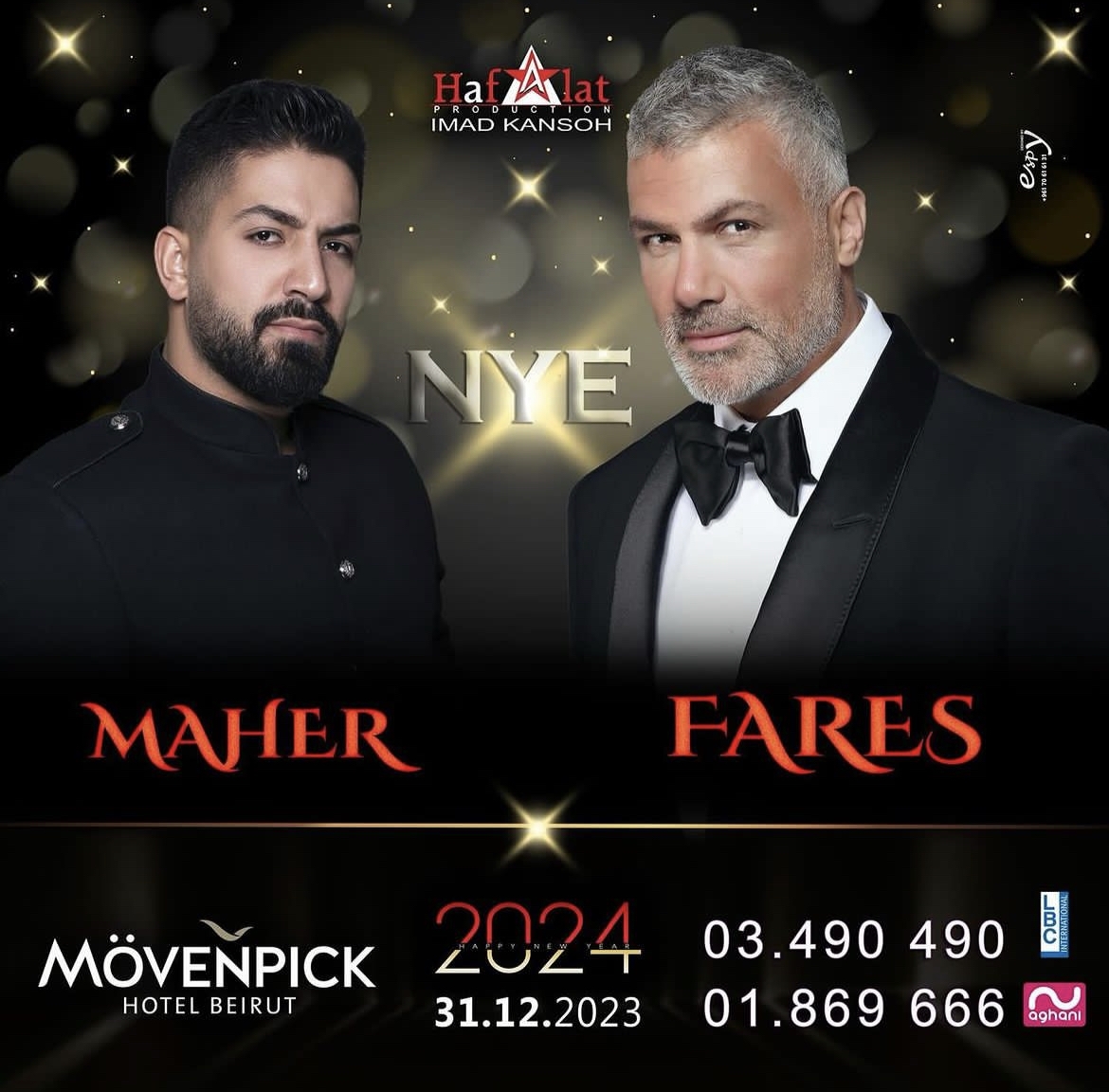 وفي فندق الموفنبيك، يحيي الفنانان فارس كرم وماهر الجاه سهرة رأس السنة. وتراوح أسعار البطاقات ما بين 100 و300 دولار للبطاقة.