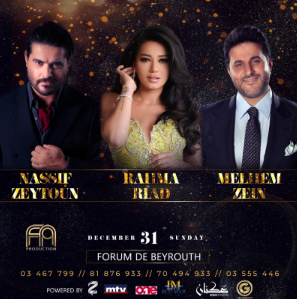كذلك، يحيي الفنانون: ناصيف زيتون،ملحم زين، غي مانوكيان، كارلوس، رحمة رياض (من العراق)، ولين حايك، حفلة رأس السنة في الفوروم دو بيروت. وتراوح أسعار البطاقات ما بين 200 و800 دولار.