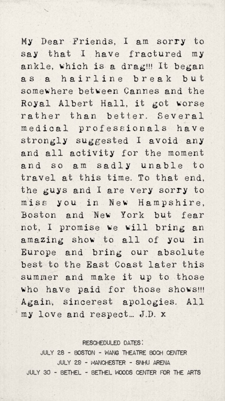 وختم رسالته: "أعدكم بأننا سنقدّم عرضًا رائعًا في أوروبا، ونقدّم أفضل ما لدينا في الساحل الشرقي، في وقت لاحق من هذا الصيف، بالإضافة إلى أننا سنعوّض كلّ من دفع ثمن تلك العروض ".