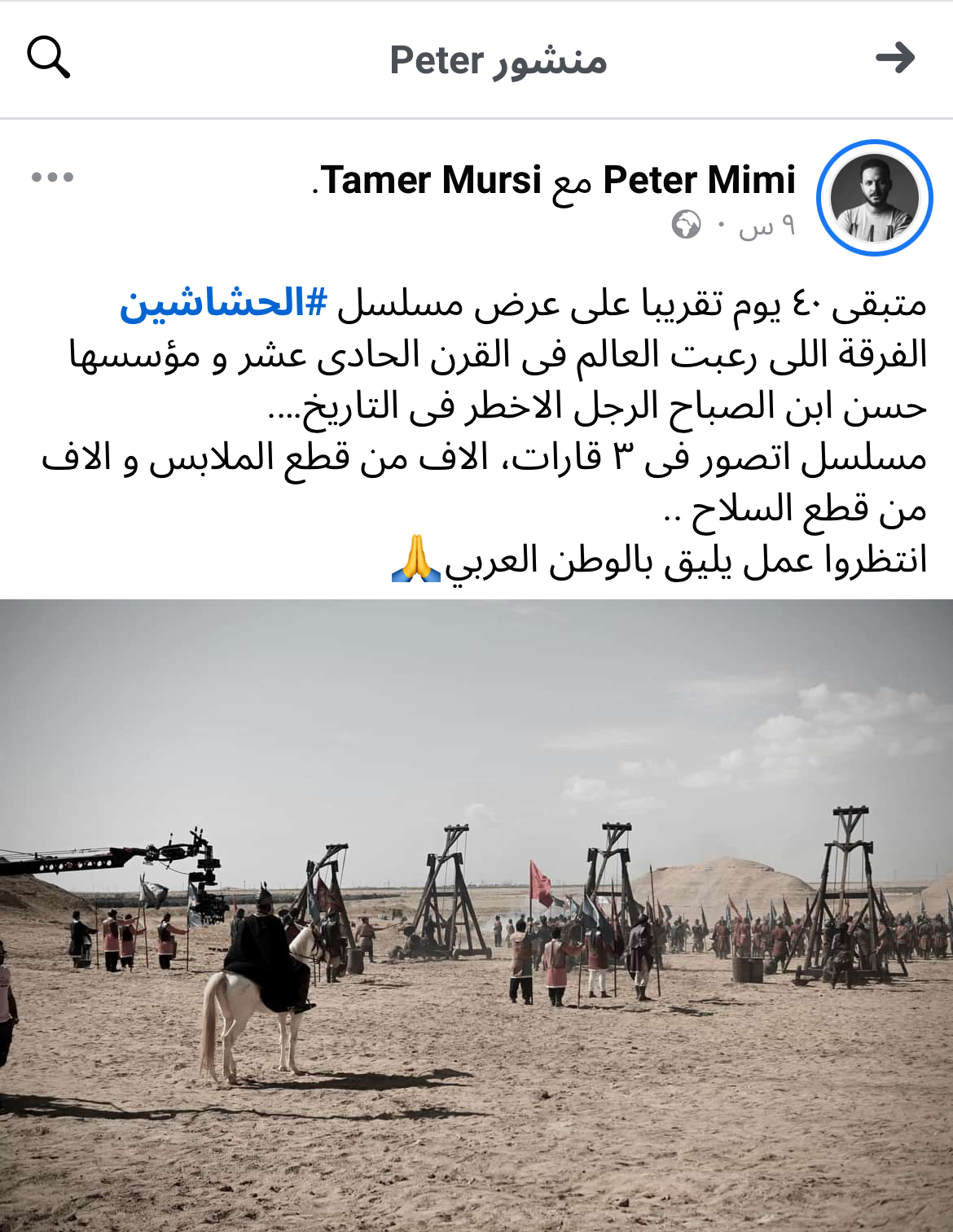 شوّق المخرج المصري بيتر ميمي، الجمهور لمشاهدة مسلسله المنتظر "الحشاشين" الذي يتعاون فيه مع النجم كريم عبدالعزيز، ومن المقرر أن يخوضا به المنافسة الدرامية التي يشهدها الموسم الرمضاني المقبل.