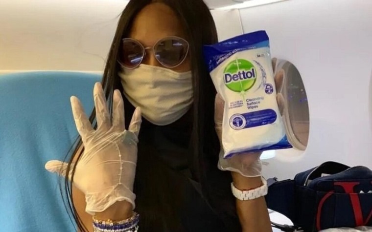 وخلال جائحة كوفيد، سافرت عارضة الأزياء بالطائرة مرتدية بدلة واقية كاملة ونظارات واقية، بالإضافة إلى قناع ودرع للوجه.