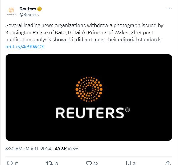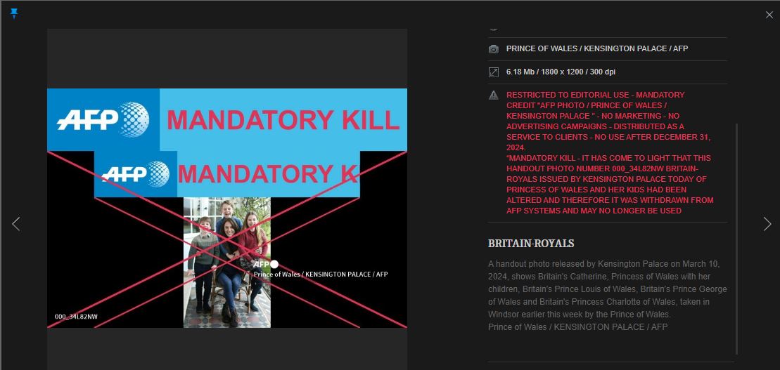 وقالت وكالة "فرانس برس" في مذكّرة إلى عملائها: "لقد تبيّن أنّ الصورة التي نشرها قصر كنسينغتون، اليوم، لكيت وأطفالها، تمّ تعديلها، وبالتالي تمّ سحبها من أنظمة الوكالة".