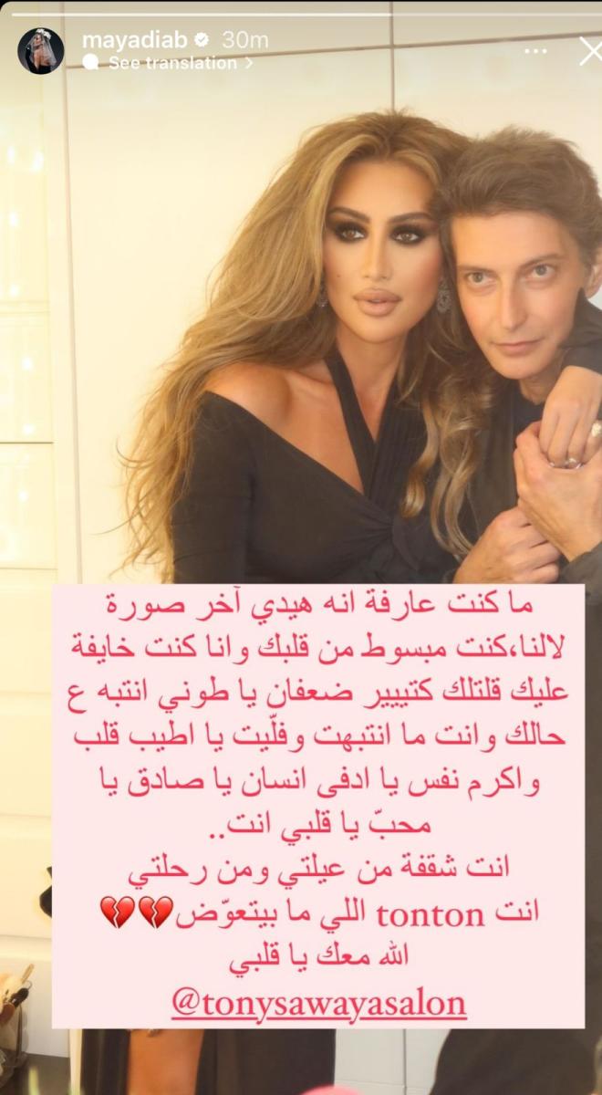 نعت الفنانة مايا دياب مصفف الشعر طوني صوايا الذي وافته المنية قبل ساعات قليلة.