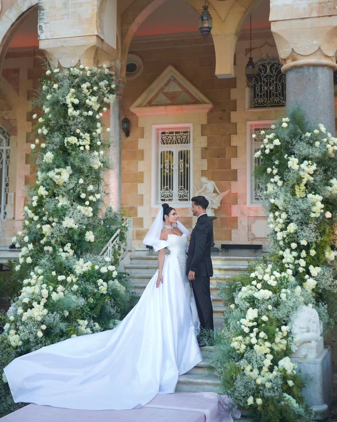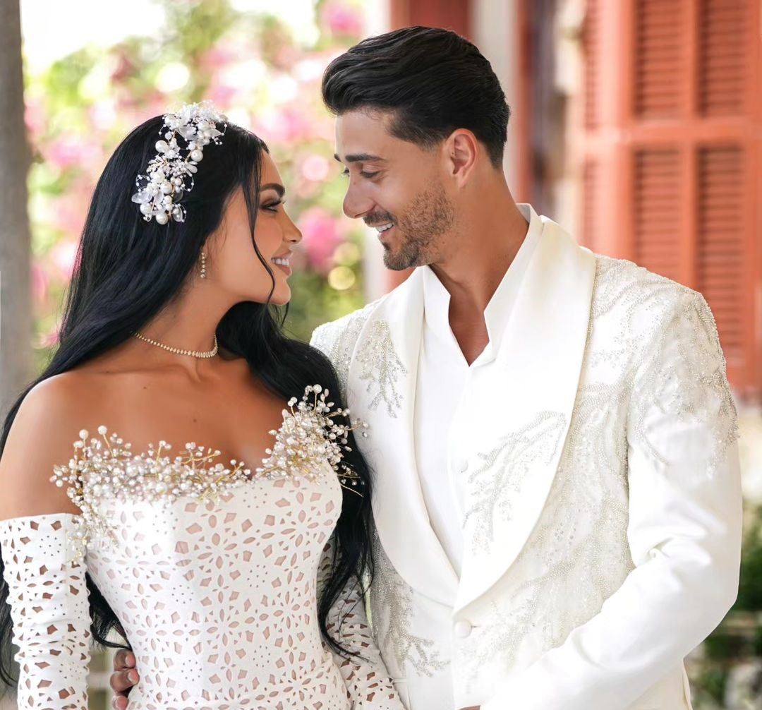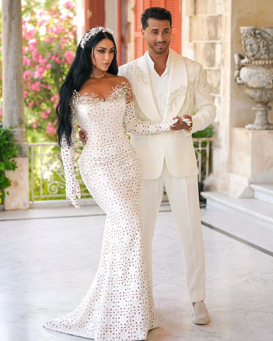 نسّق العريس إطلالته أيضاً مع شيرين، فتألّق ببذلة بيضاء تزيّنت بالقليل من الزخارف والخرز الأبيض.