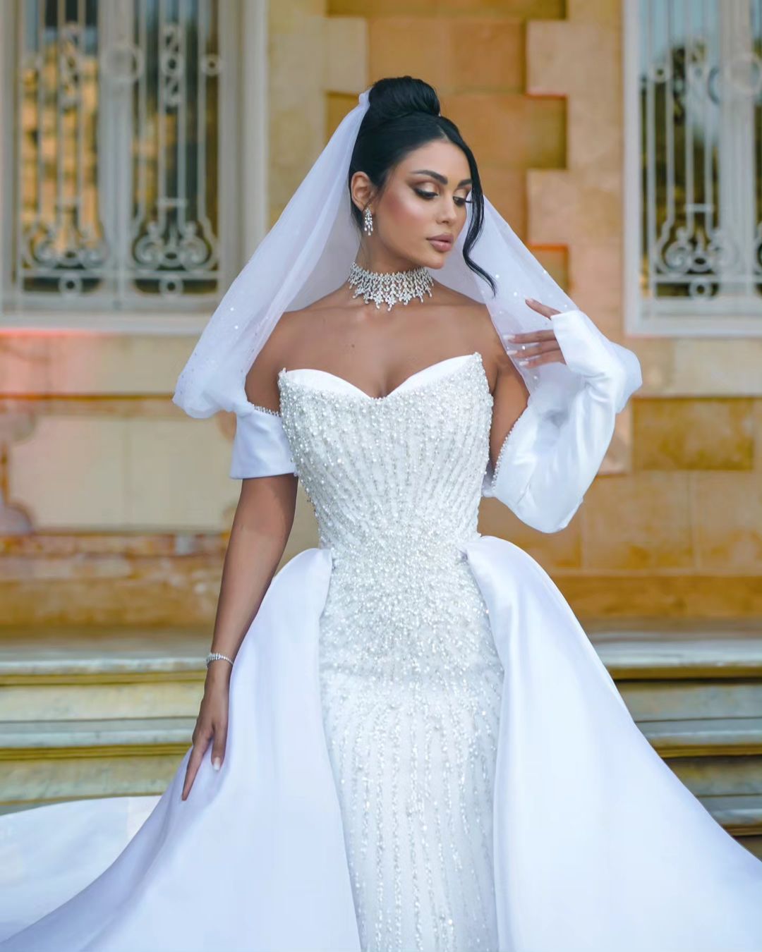 أمّا خلال الحفل، فأطلّت العروس بفستانٍ أبيض آخر مع القفازات الطويلة، وازدان بالأزهار الصغيرة البيضاء والزخارف.