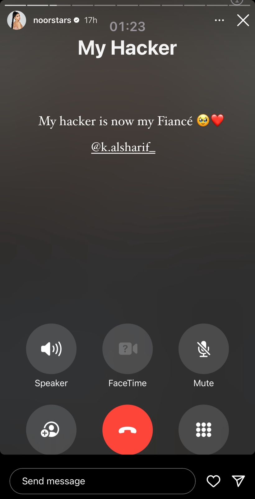 وكانت نور قد أعلنت قبل خطوبتها اختراق حسابها الرسمي في إنستغرام، ليتضح بعدها أنه خطيبها كريم الشريف، إذ كتبت عبر خاصية الـ"ستوري": "الهاكر الذي اخترق حسابي هو الآن خطيبي".