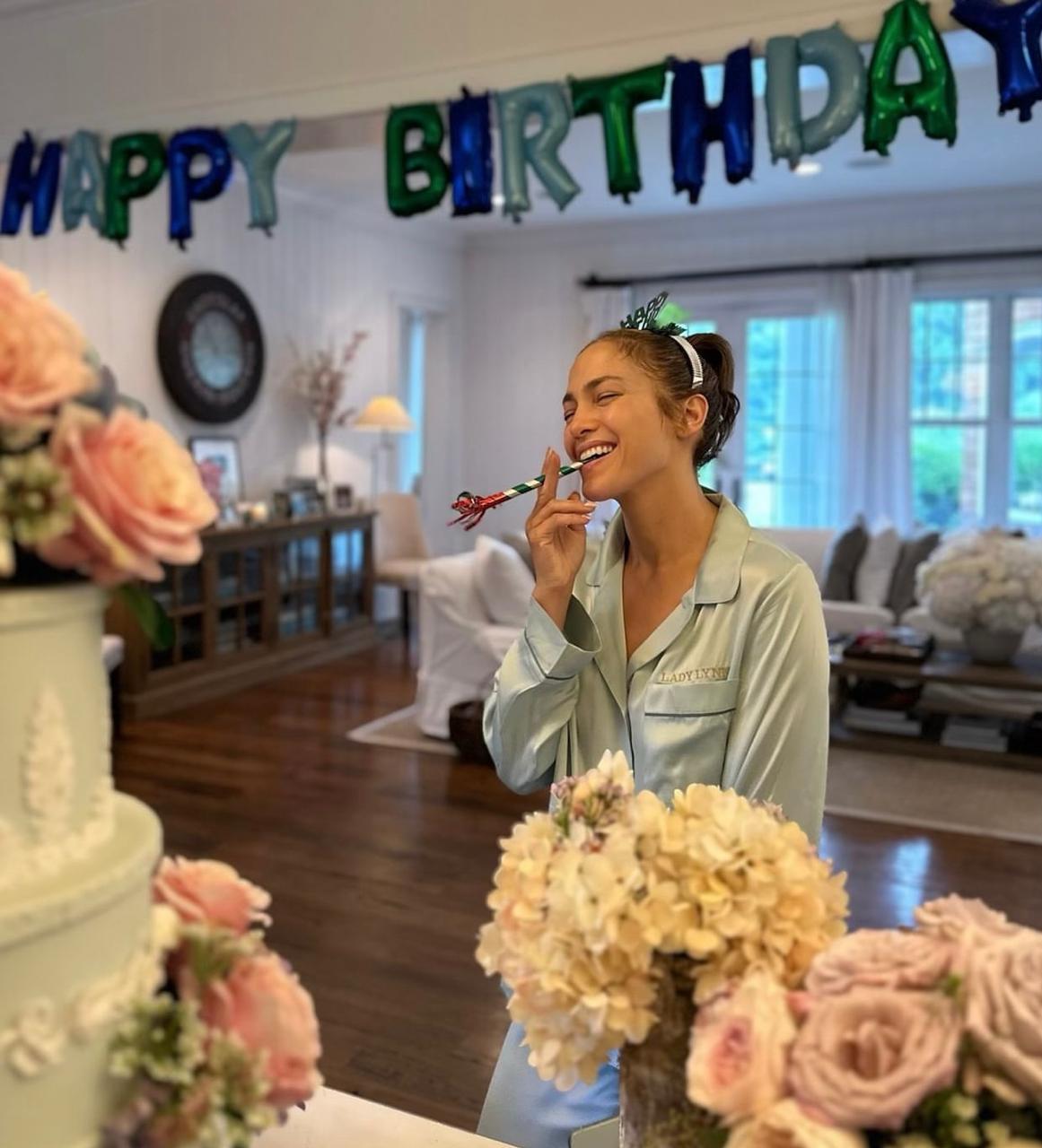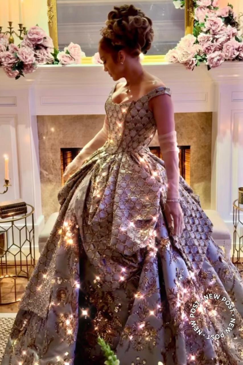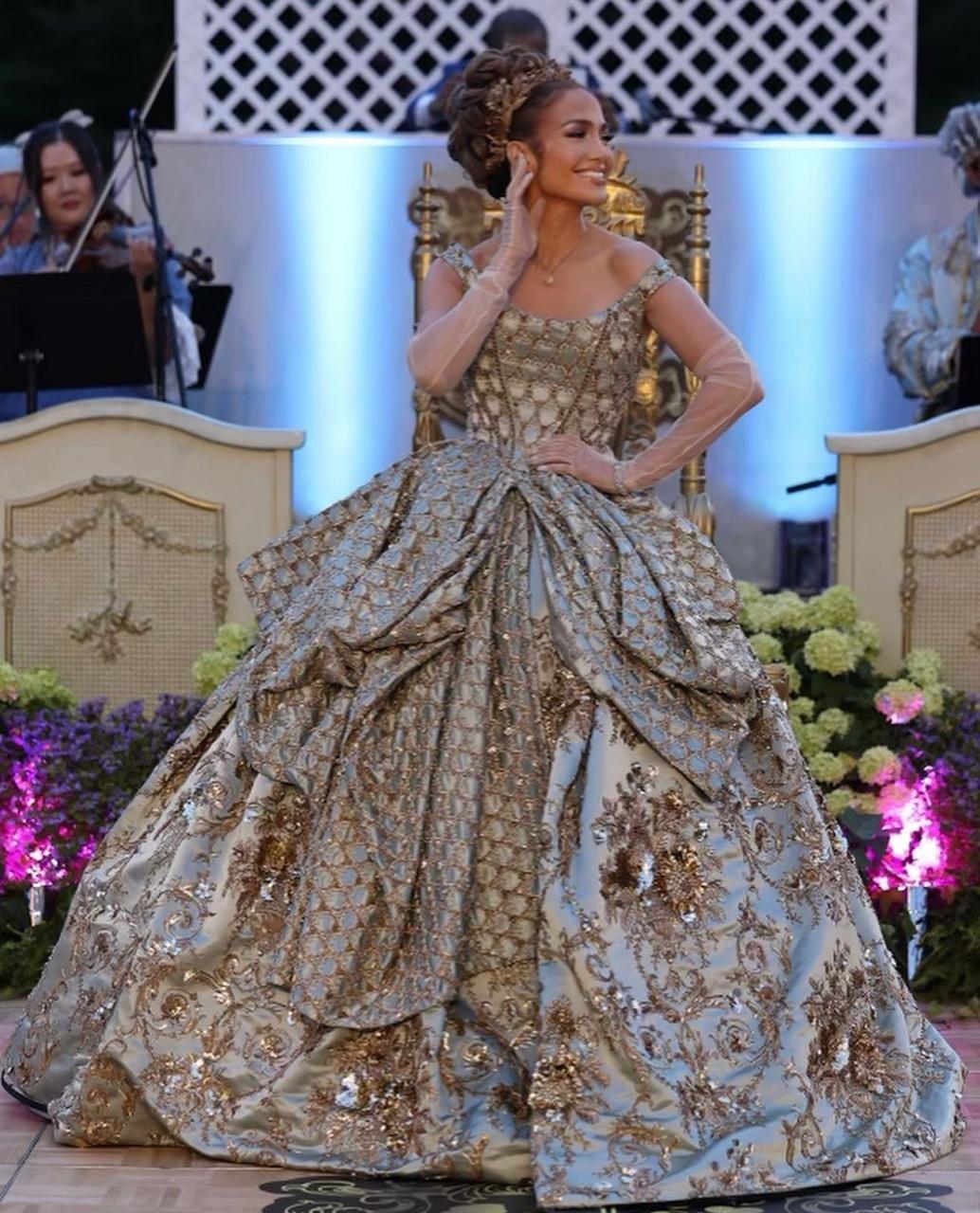 في إطار أسطوري مستوحى من المسلسل الناجح Bridgerton، احتفلت جينيفر لوبيز بعيد ميلادها مع مجموعة من المشاهير والأصدقاء المقرّبين، وارتدت فستاناً رائعاً صُمّم خصّيصاً لها حمل توقيع المصمّم الهندي المبدع Manish Malhotra. وقد عمل على تطريز الفستان يدوياً 40 حرفي من الدار الهنديّة العريقة، استغرق 3,490 ساعة من العمل الدؤوب. وجاء الفستان بقصّة طويلة منفوخة مؤلّفة من 3 طبقات، بدون كُمّيْن، منحوت الخصر بنمط ال "كورسيه"، وهومطرّز على شكل أزهار وبتلاتها بالخرز وما يقارب نصف مليون حجرة كريستال برّاقة تمّت معالجتها لتحافظ على لونها وبريقها. كذلك، انتعلت جينيفر كندرة بمنصّة ضخمة وكعبٍ عريض شاهق من الجلد الذهبي اللمّاع، وتزيّنت بمجوهرات من Manish Malhotra High Jewellery، كما وضعت قفّازات "أوبرا" شفّافة بلون فستانها.