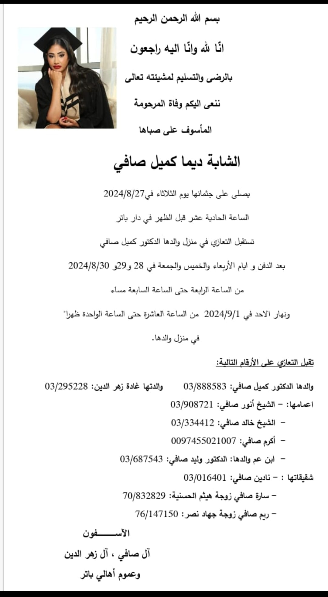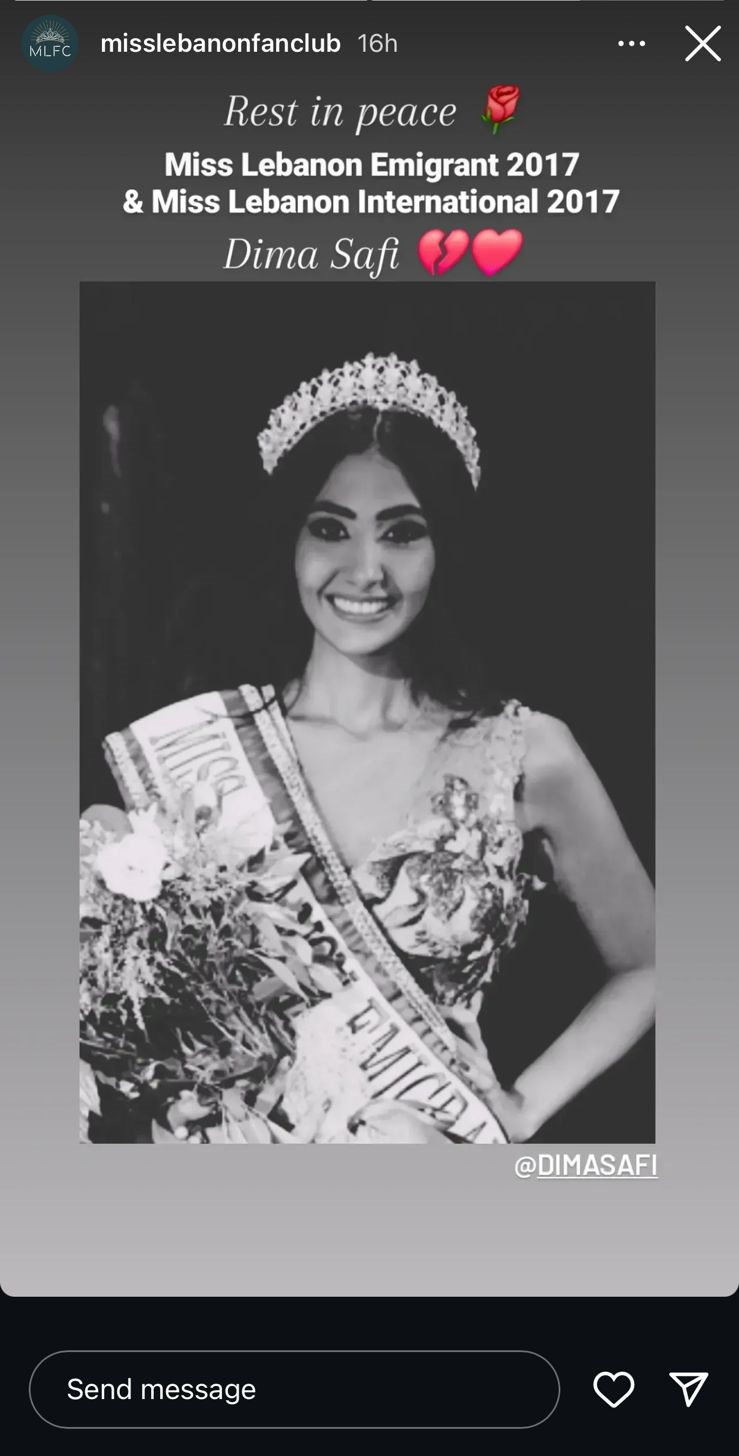 توفيت ملكة جمال لبنان السابقة للاغتراب، لعام 2017، و"ملكة جمال لبنان أنترناسيونال"، ديما صافي، يوم الأحد، عن عمر ناهز الـ30 عاماً، بعد إصابتها بأزمة قلبية.