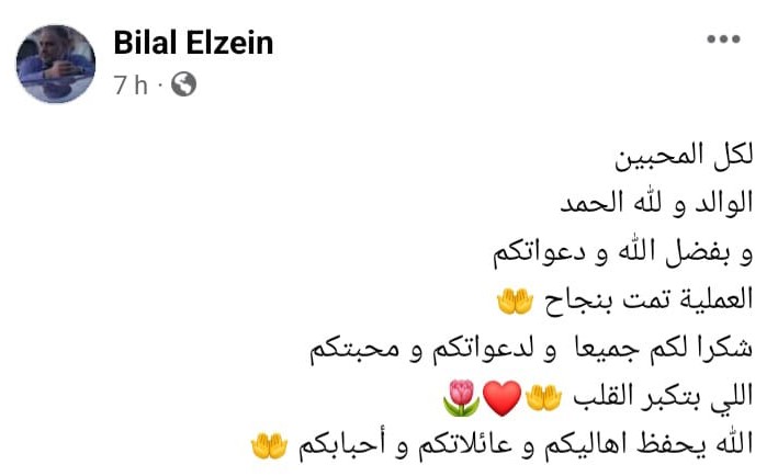ونشر الزين الابن، عبر حسابه في "إنستغرام"، منشوراً أكد فيه أنّ والده بخير، وكتب: "إلى المحبّين، الوالد ولله الحمد وبفضل الله ودعواتكم، العملية تمّت بالنجاح، شكراً لكم جميعاً ولدعواتكم ومحبتكم اللي بتكبر القلب، الله يحفظ أهاليكم وعائلاتكم وأحبابكم".