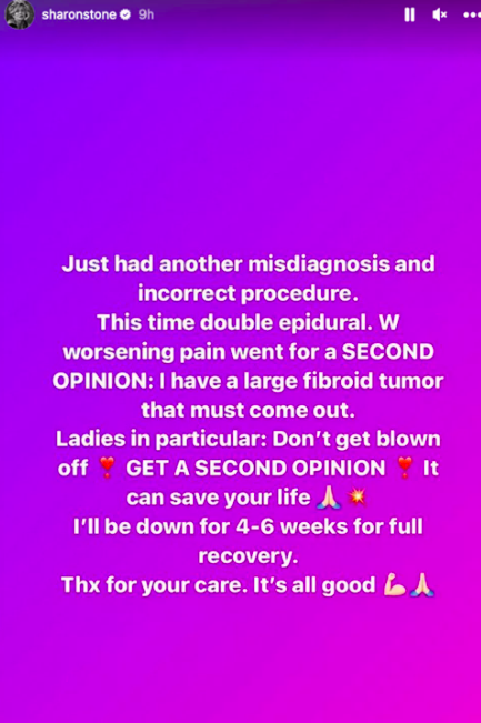 صدمت الممثلة العالمية شارون ستون (64 عاماً) الجمهور بمشاركتها خبر إصابتها بالورم الليفيّ الرحميّ بعد تشخيص أحد الأطباء مرضها بشكل خاطئ.