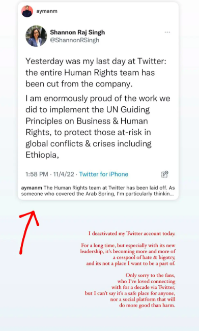 وفي التفاصيل، أعلنت عارضة الأزياء (27 عاماً) إلغاء تنشيط حسابها على "تويتر" وسط تسريح جماعيّ للموظّفين، بما في ذلك فريق حقوق الإنسان.
