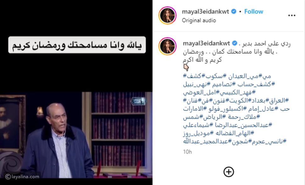 وردت على الفيديو، وبادلته التسامح أيضاً، إذ كتبت: "ردي على أحمد بدير... يا الله وأنا مسامحاك... ورمضان كريم والله أكرم".